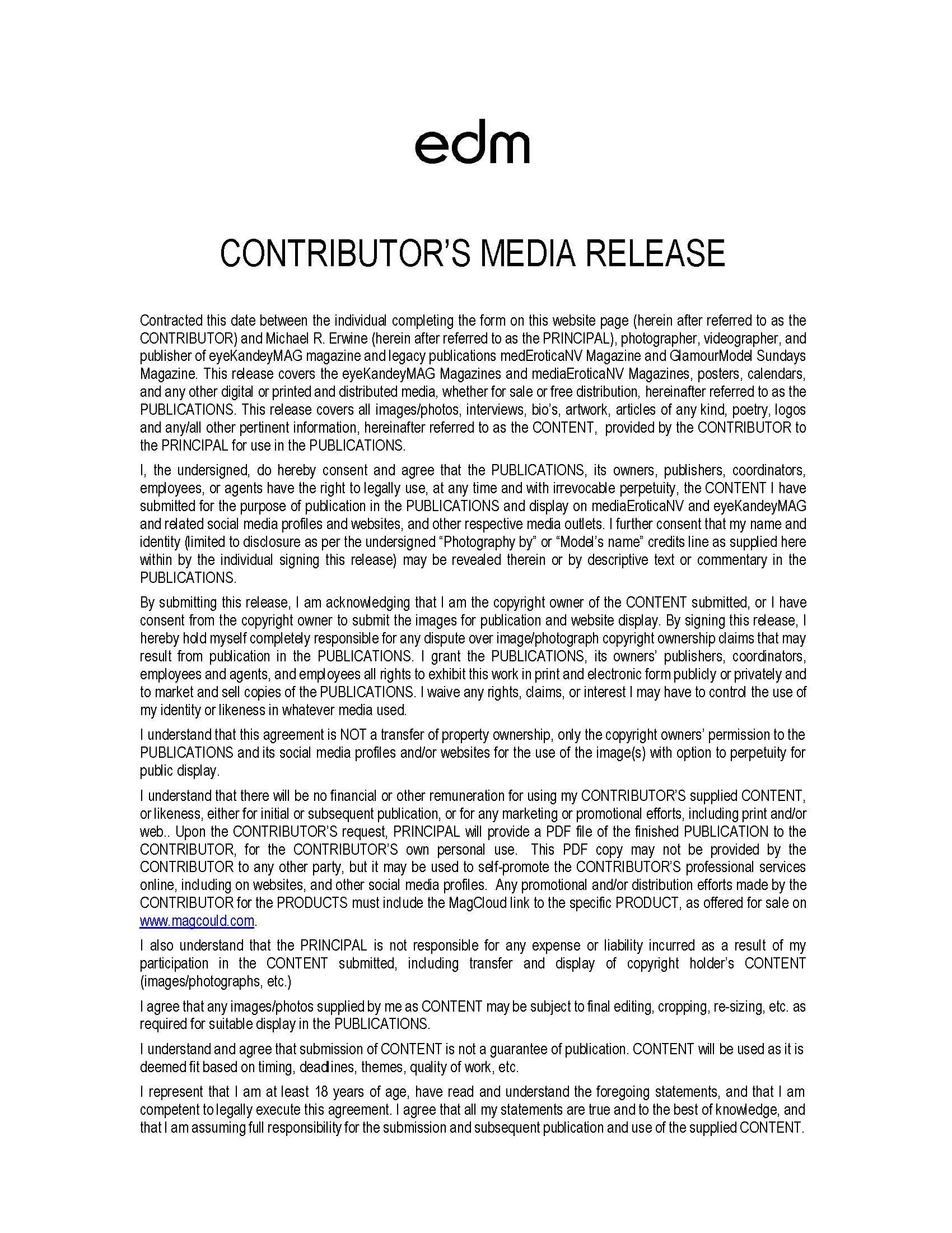 By completing this release and submitting it you are agreeing to the terms of the contributor’s release as outlined below in the detailed document. Simply click on the document to expand it in a new browser window where you can zoom in on it for easier reading.